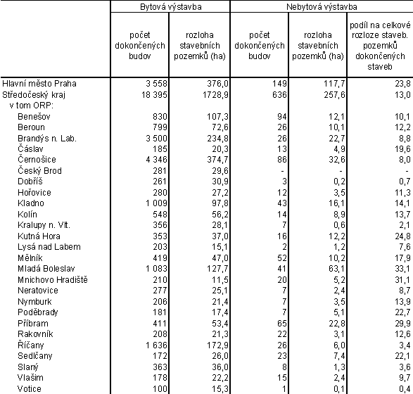 Nejintenzivněji (v přepočtu na bydlící obyvatelstvo) se byty zahajovaly v ORP Brandýs n.L-Stará Boleslav, Černošice, Lysá n.L a Říčany, kde hodnota poměrného ukazatele přesáhla 100 zahájených bytů na 1 000 obyvatel středního stavu.