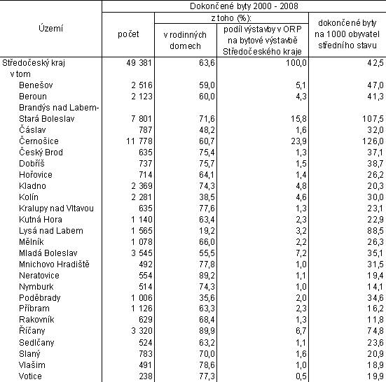Ve Středočeském kraji byly zahájené byty v období 2000-2008 nejvíce soustředěny do správních obvodů obcí s rozšířenou pravomocí (ORP) sousedících s Prahou a v ORP Mladá Boleslav. V celém Středočeském kraji bylo zahájeno 65 695 bytů. V obvodech Černošice, Brandýs n. L. – Stará Boleslav a Říčany byly zahájeny více než dvě pětiny plánované výstavby ve Středočeském kraji v letech 2000-2008. Hranici 4 tis. plánovaných bytů byla překročena v obvodu Mladá Boleslav, která v rámci Středočeského kraje tvoří samostatné regionální centrum.