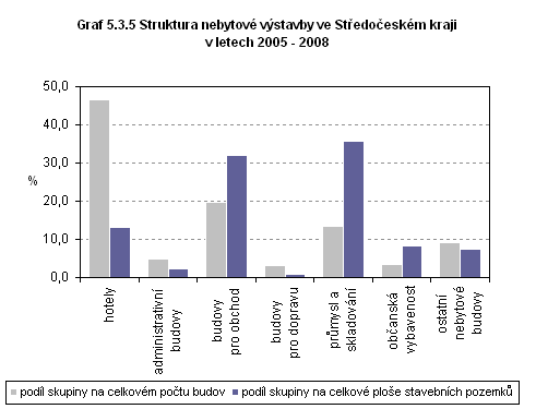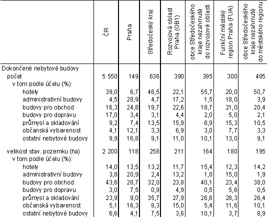 V Praze tvořil podíl nebytových budov na nové výstavbě 4 % dokončených budov, Ve Středočeském kraji byl tento poměr velmi podobný, 3,3 %. Nižší zastoupení nebytové výstavby souvisí především s faktem, že bytová výstavba v okolí Prahy je soustředěna do masivní výstavby rodinných domů s malým počtem bytů. Ve Středočeském kraji bylo v letech 2005-2008 dokončeno 636 nebytových budov o celkové rozloze stavebních pozemků 258 ha, průměrná výměra pozemku pro nebytovou stavbu byla 4 tis. m2, pro budovu s byty byl průměr necelých 1 000 m2.