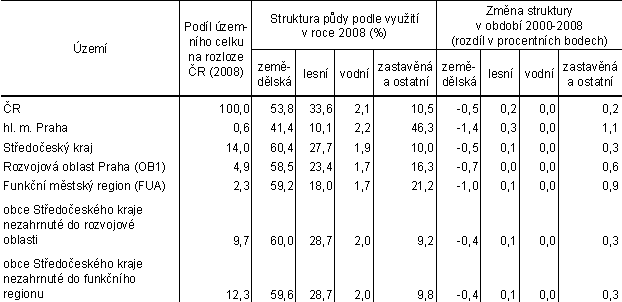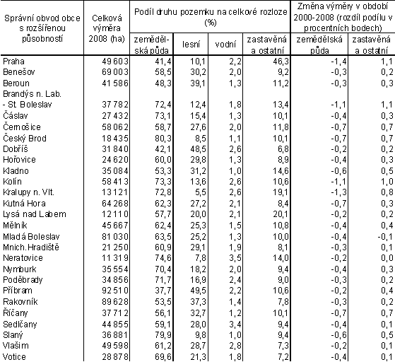 Není překvapující, že nejvyšší pokles zastoupení zemědělské půdy ve výměře území byl v hlavním městě, na druhou stranu zvýšení podílu zastavěných ploch nebyl razantní, přírůstek byl i v kategoriích lesa a vodních ploch. Na území sousedního Středočeského kraje byly nejvyšší úbytky zemědělských ploch v obvodech Kralup nad Vltavou, Brandýsa nad Labem – Staré Boleslavi a Kolína. Přírůstek ploch v kategorii zastavěných a ostatních ploch 7) v podstatě koresponduje s úbytkem zastoupení zemědělské půdy v půdním fondu.