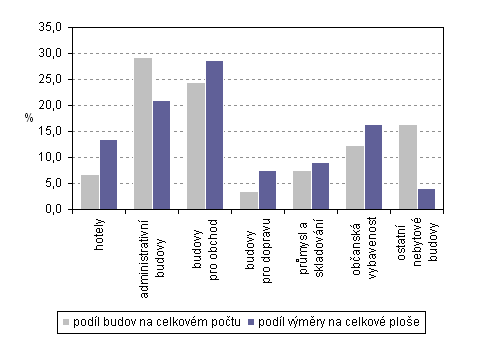 Na území Prahy je rozdělení nebytové výstavby mírně odlišné od průměru za území celé ČR. Významný podíl nových budov tvoří administrativní budovy, budovy pro obchod a objekty občanské vybavenosti.