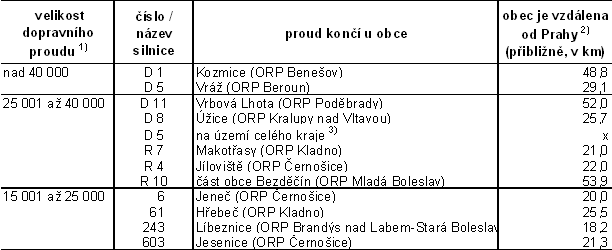 Největší intenzity dopravy byly naměřeny na dálnici D1 (brněnská) a D5 (plzeňská). Celkem 40 000 a více vozidel bylo sečteno za 24 hodin v úseku od hranic Prahy k obci Kozmice na dálnici D1 a na dálnici D 5 k obci Vráž. Další informace o velikosti dopravních proudů lze nalézt v následující tabulce.