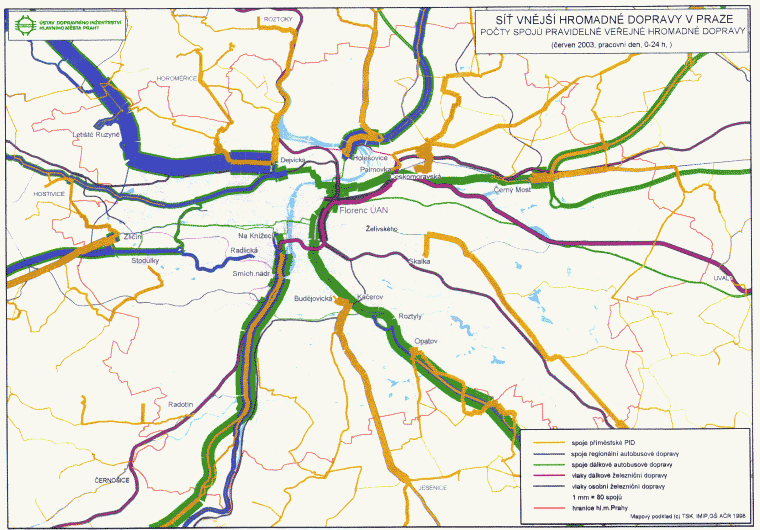 Obrázek 5.5.1 Počty spojů pravidelné veřejné vnější hromadné dopravy (červen 2003)