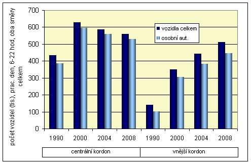 *) intenzita dopravy – na centrálním a vnějším kordonu jsou měřeny počty vozidel, které projedou sčítacími úseky obou kordonů v pracovním dni za oba směry celkem v období 6.-22.hodina