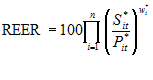 | kde | Si* - | bazický index tuzemské měny k měně i-tého obchodního partnera v období t | | Pi* - | poměr bazického cenového indexu i-tého obchodního partnera v období t k bazickému cenovému indexu ČR v období t, kde bazický rok je stejný jako bazický rok při výpočtu Si* | | wi* - | normalizované váhy měny i-tého obchodního partnera |