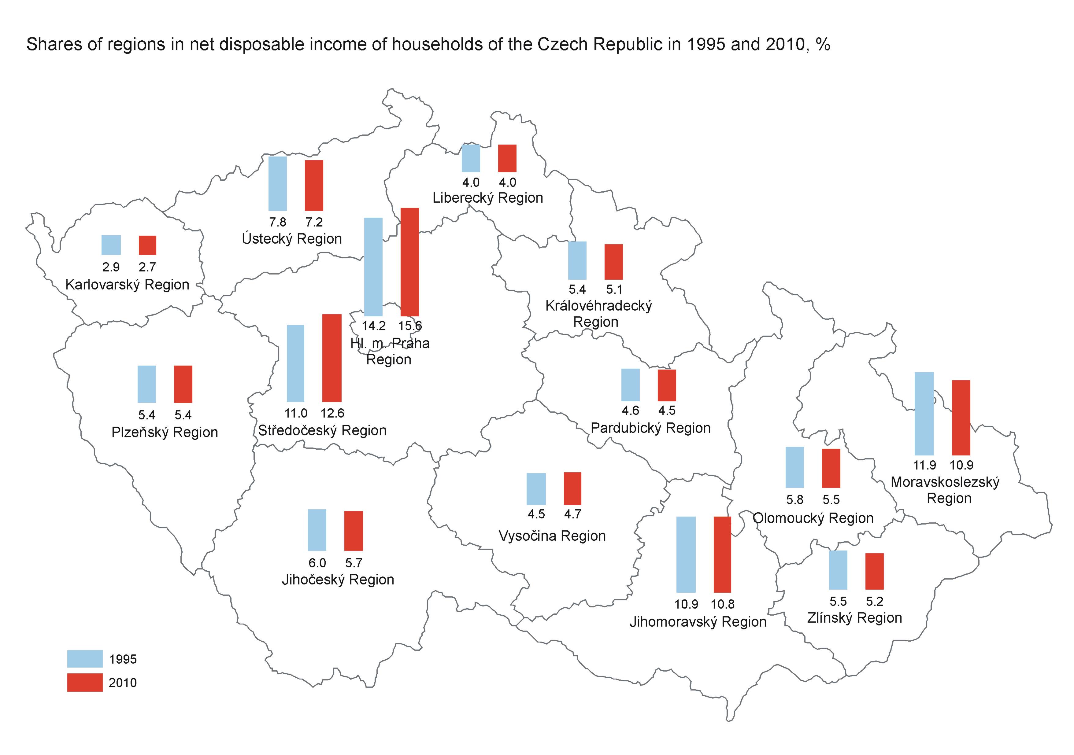 Share of regions in net disponsible income of households of the Czech Republic in 1995 and 2010, %