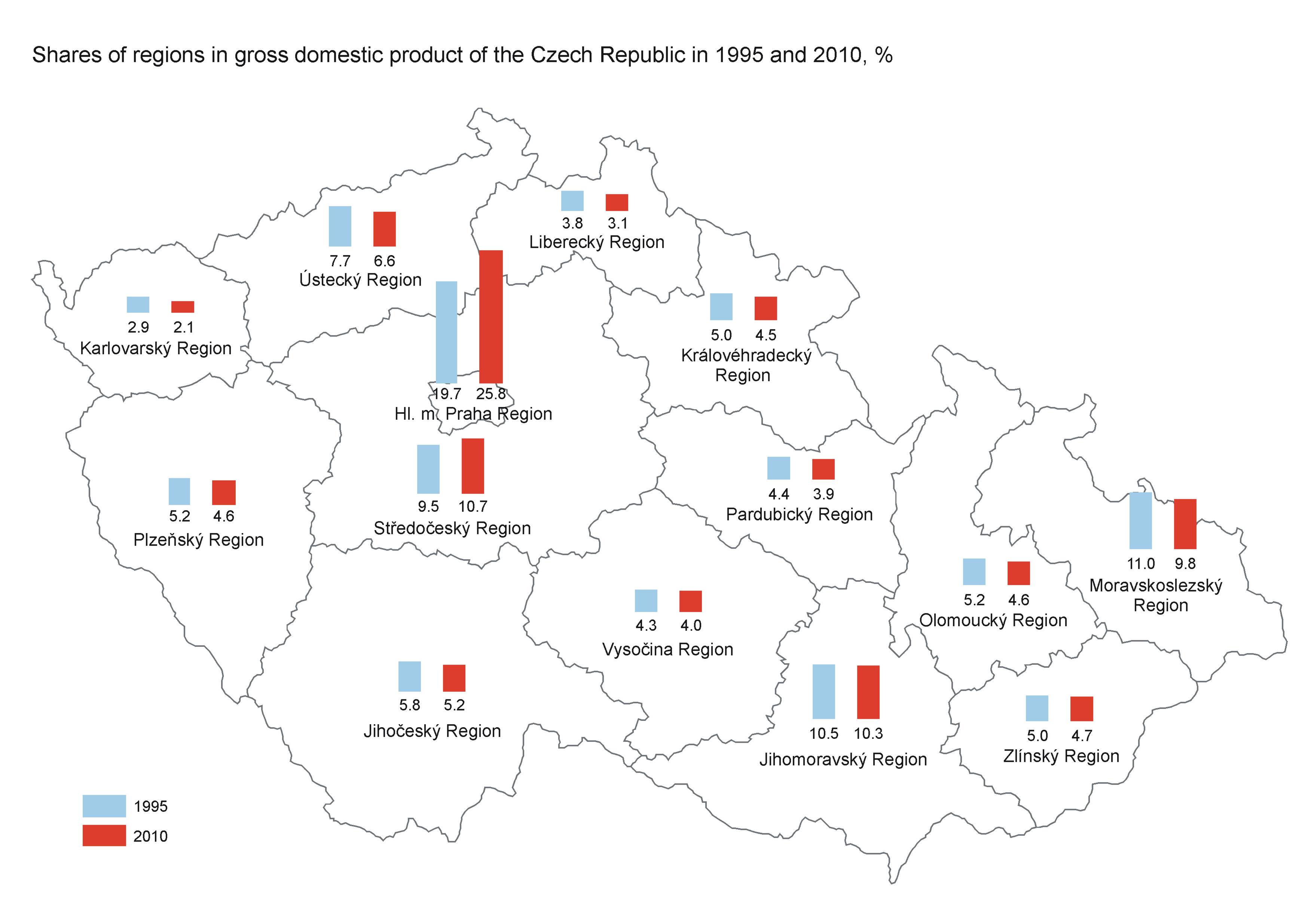 Share of regions in gross domestic product of the Czech Republic in 1995 and 2010, %