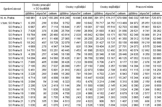 U osob, které měly bydliště v Praze byla sledována i přesná adresa pracoviště, takže bylo možné určit také městskou část, která je cílem jejich dojížďky. Tak tomu bylo i u osob přijíždějících do Prahy z obcí Středočeského kraje, kterých bylo 95 934, ale přesný cíl dojížďky na území hlavního města byl zjištěn jen u 65 573 osob bydlících ve Středočeském kraji. Zbylí dojíždějící jsou z ostatních krajů ČR, u kterých nebylo přesné místo pracoviště v Praze zjišťováno. Z celkového úhrnu 163 108 osob dojíždějících za prací do Prahy z jiných částí ČR je tedy přesné místo pracoviště známé u 2/5 těchto osob. Přesný cíl dojížďky (městskou část) známe u 65 573 osob ze Středočeského kraje a u 421 116 osob dojíždějících v rámci hlavního města, dohromady u 486 689 dojíždějících, což je u dvou třetin všech pracujících v Praze.
