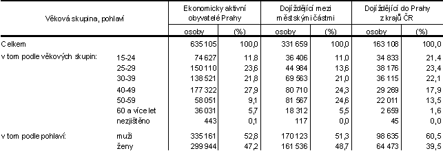 Složení dojíždějících osob za prací podle věku je rozdílné podle prostorového typu dojížďky. Mezi dojíždějícími uvnitř Prahy tvoří osoby 40leté a starší většinu pohybujících se za prací. Stejná věková skupina představuje mezi dojíždějícími z jiných částí republiky pouze třetinu. Věkové složení dojíždějících v rámci Prahy více koresponduje s celkovou strukturou ekonomicky aktivních osob bydlících v hlavním městě. Věkovou strukturu dojíždějících uvnitř Prahy máme k dispozici i v členění do správních obvodů respektive městských částí.