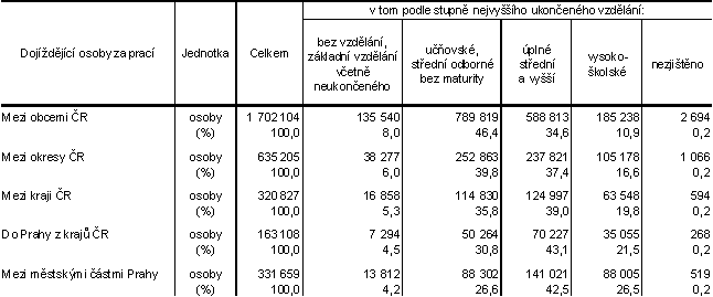 Prostorový typ dojížďky souvisí i s vzdělanostním složením dojíždějících obyvatel. Mezi obcemi ČR nejčastěji dojíždějí osoby se středoškolským vzděláním bez maturity, vysokoškoláci představují v rámci tohoto typu dojížďky jen desetinu. Mezi osobami dojíždějícími přes hranice okresu se snižuje zastoupení osob se základním vzděláním a středoškolským bez maturity, naopak roste podíl zaměstnaných osob s úplným středním a vysokoškolským vzděláním. Tento trend je patrný i u zaměstnaných osob dojíždějících do jiného kraje. V tomto prostorovém typu dojížďky jsou nejpočetnější skupinou osoby se středním vzděláním s maturitou a osoby s vysokoškolským vzděláním se na celkovém počtu osob cestujících za prací mezi kraji ČR podílejí již pětinou.