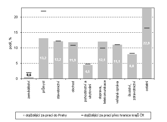 Ve struktuře dojíždějících osob mají výrazně větší podíl na celku osoby pracující v odvětví stavebnictví, v odvětví dopravy, pošt a telekomunikací a v odvětví veřejné správy. Naopak výrazně menší je mezi dojíždějícími osobami zastoupení osob v odvětví školství, zdravotnictví a sociální činnosti. V těchto odvětvích jsou místa ve větší míře obsazena obyvateli Prahy než osobami za prací dojíždějícími z jiných částí republiky. Porovnáme-li strukturu dojíždějících přes hranice krajů v celé republice s dojíždějícími do Prahy, je zřejmé, že v celé ČR dojíždějí za prací nejčastěji zaměstnanci z průmyslu a naproti tomu v Praze je poptávka právě u oněch nespecifikovaných odvětví terciární sféry.