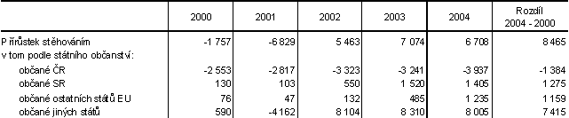 Tento vysoký nárůst přistěhovalých musíme ale posuzovat v souvislosti s již zmíněným metodickým posunem, který se týká dlouhodobého pobytu cizinců. V roce 2004 se do Prahy přistěhovalo 18 144 cizích státních příslušníků a 10 619 občanů ČR, cizinci v roce 2004 tedy představovali 63 % všech přistěhovalých (v roce 2002 to bylo 66 %). Pokud bychom posuzovali počty přistěhovalých občanů ČR, tak se jejich výše příliš neliší od ročních údajů ze 2. poloviny 90. let. Je to kolem 10 000 přistěhovalých a jsou to ve srovnání s celým poválečným obdobím nejnižší hodnoty.