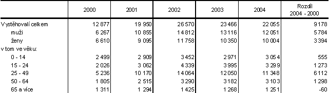 Také počet vystěhovalých v roce 2004 přesahuje o více než polovinu průměrné roční počty vystěhovalých za posledních 50 let. Dlouhodobý vývoj ročních počtů vystěhovalých z hlavního města více méně kopíruje vývoj počtů přistěhovalých, ale v nižších hodnotách s několika výkyvy. Jeden z těchto výkyvů byl zaznamenán právě koncem 90. let (v letech 1998 až 2001), kdy tehdy nadprůměrné počty vystěhovalých převýšily počty přistěhovalých. Vůbec nejvyšší počty vystěhovalých však byly kromě poválečných let právě v posledním, sledovaném období. Narozdíl od přistěhovalých zde působí početní stav i charakter výchozí populace poněkud významněji, i když počty vystěhovalých jsou vázány spíše na mimodemografické faktory. Metodická úprava, spočívající v započtení cizích státních příslušníků s dlouhodobým pobytem, se výrazně projevila i u počtu vystěhovalých. Skutečnost, že hlavně tito příchozí obyvatelé jsou motivováni často pouze krátkodobou pracovní nabídkou a jsou ochotni flexibilně měnit místo svého pobytu, ovlivňuje zvýšený pohyb migrantů oběma směry.
