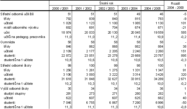 Ve středním školství se počet žáků v posledních dvou letech nejvíce zvýšil na středních odborných školách (ve srovnání se školním rokem 2000/2001 o 8,4 %). U gymnázií to bylo zvýšení nižší (o 3,9 %) a na středních odborných učilištích se počet studentů zvýšil neméně (o 3,1 %). Mírně poklesl počet studentů vyšších odborných škol, pro které se stávají stále silnější konkurencí školy vysoké. Počet středních škol se příliš nemění. Ubylo pouze 5 středních odborných učilišť. Ovšem počty pedagogických pracovníků rostou rychleji než počty studentů. Největší disparitu v tomto směru zaznamenala gymnázia, kde počet učitelů vzrostl za posledních 5 let o 7,2 % a žáků o 3,9 %.