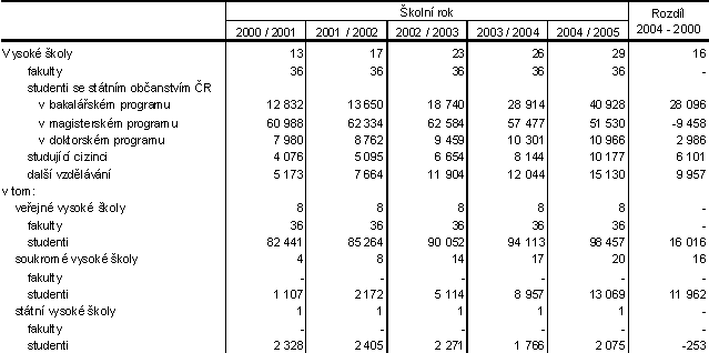 Počty studentů vysokých škol ve sledovaném období narostly nejdynamičtěji. Mezi studenty vysokých škol stále posiluje zastoupení cizích státních příslušníků. Ze všech studentů vysokých škol v roce 2000/2001 bylo 4,5 % cizinců a v roce 2004/2005 to bylo již 7,9 %. Celkem se za sledované období počet VŠ studentů zvýšil o 41 % a počet studentů cizinců o 50 %. Pokud jde o různé typy vysokoškolského studia, nejvýrazněji vzrostly počty studentů bakalářského studia, které je stále více prosazováno nejen v soukromých vysokých školách. Zatímco v roce 2000/2001 bakalářské programy pražských vysokých škol navštěvovalo necelých 16 % studentů prezenčního studia (bez cizích státních příslušníků), v roce 2004/2005 to již bylo necelých 40 %.