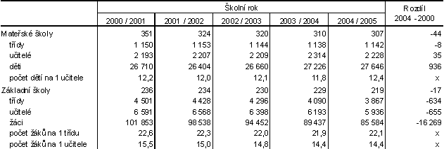 Počet základních škol také poklesl, ale zde je zřetelný i trvající pokles počtu žáků a potažmo i učitelů. Tento pokles se nezastavil a pokračoval i v posledním roce. Zmiňovaný nárůst porodnosti se projevil až po roce 2000 a vyšší počty narozených dětí se dostanou do věku školní docházky až v nadcházejících letech.