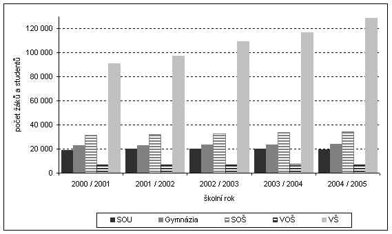 Zatímco v základním školství je patrný úbytek žáků a tříd a v současné době dochází i k redukci počtu škol, střední školství zaznamenává dlouhodobý nárůst počtu žáků, a to zejména u středních odborných škol a gymnázií.