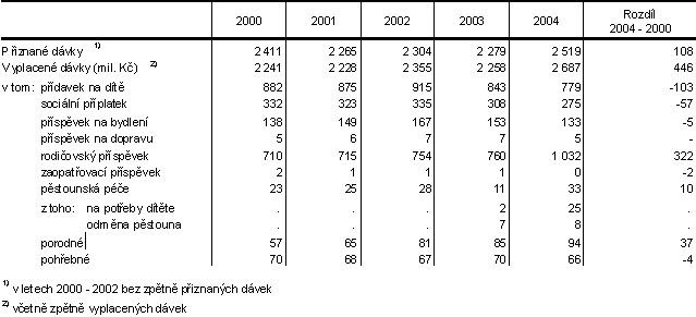 Vývoj výše vyplacených dávek se v Praze vyznačuje nárůstem rodičovského příspěvku a porodného a současně vzrostly i vyplacené dávky pěstounské péče. Ostatní dávky se od roku 2000 snížily. Více méně stagnují příspěvky na dopravu. Obdobný vývoj výše vyplacených sociálních dávek byl zaznamenán i v celé ČR s tím, že v Praze bylo zvýšení poněkud vyšší. Není bez zajímavosti, že v Praze, kde jsou trvale zvýšené náklady spojené s bydlením poklesly od roku 2000 roční příspěvky na bydlení o 3,6 % zatímco v ČR celkem se o 2,1 % zvýšily. Nejvýraznější nárůst byl zaznamenán v Praze tak jako i v ČR celkem u porodného. Zde byl v Praze nárůst o 64,9 % a v ČR 43,7 %. Je to dáno jednak zvyšováním této jednorázové sociální dávky při narození dítěte (čtyřnásobek životního minima), ale také růstem porodnosti, který byl v Praze výrazně rychlejší než v ČR celkem. Počet živě narozených se v Praze od roku 2000 zvýšil o 17,8 % a v republice úhrnem o 7,4 %.
