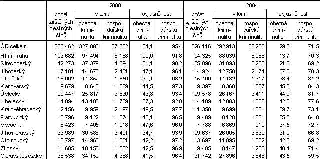 K výraznému poklesu objasněnosti došlo ve všech krajích i u hospodářské kriminality, kde je tento ukazatel obecně na vyšší úrovni. V roce 2000 byla v Praze objasněnost hospodářských trestných činů nejnižší ze všech krajů, ale přesahovala 90 %. V roce 2004 již v některých krajích poklesla objasněnost na tolik, že se pohybuje i pod 70 %. Vůbec nejnižší byla v Moravskoslezském kraji, kde nedosáhla ani 60 %. V Praze se objasněnost blížila k celorepublikovému průměru.