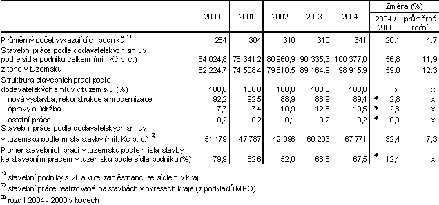Ve stavebnictví dochází k neustálému zlepšování příznivých výsledků. Na území kraje má v posledních letech sídlo přes 300 stavebních podniků, kdy v roce 2004 došlo k výraznějšímu nárůstu jejich počtu (viz následující tabulka). Stavební práce podle dodavatelských smluv v průměru ročně rostly o více než 10 %, tedy rychleji než růst cen stavebních prací v ČR a v roce 2004 přesáhly 100 mld. Kč. Nárůst od roku 2000 předčil o 5 procentních bodů objem stavebních prací v ČR. Pouze 1,5 % stavebních prací v kraji nebylo realizováno v tuzemsku. Značná část stavebních výkonů, které podniky sídlící v Praze realizují, směřuje za hranice samotného města.