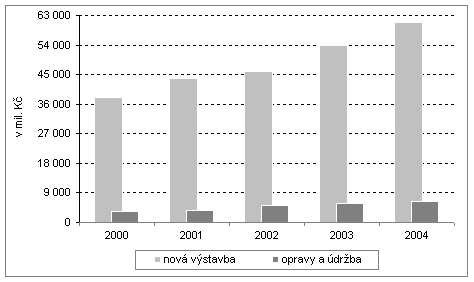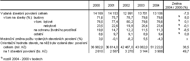 V roce 2004 bylo v kraji vydáno celkem 13,1 tis. stavebních povolení. Jde o druhý nejmenší počet ve sledovaném období. Relativní nesoulad vývoje počtu stavebních povolení s růstem stavebních prací spolu s růstem orientační hodnoty staveb naznačuje, že jsou stále více stavěny objemově významnější stavby. Celkový objem stavebních prací na území hl. m. Prahy vzrostl od roku 2000 téměř o třetinu, orientační hodnota objektů ve výstavbě vzrostla téměř o polovinu, avšak počet stavebních povolení zaznamenal mírný pokles. Hodnoty za celou ČR naznačují obdobný vývoj. Ceny stavebních prací rostou v jednotlivých letech o 2 – 4%, ale průměrná roční orientační hodnota staveb o 8 %. Dlouhodobě převládá v hlavním městě výstavba bytová.