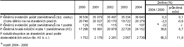 Dobré ekonomické výsledky ve stavebnictví jsou podpořeny i vyšší produktivitou práce. Ta podle dodavatelských smluv rostla meziročně v průměru o 11,8 % a oproti roku 2000 se zvýšila o 56,3 %. Svůj přínos měla i ta skutečnost, že při zvyšující se produkci byl v tomto odvětví počet zaměstnanců i přes určitou rozkolísanost víceméně konstantní. Průměrná roční změna dosáhla 0,1 % a oproti roku 2000 se počet zaměstnanců v roce 2004 zvýšil o 0,3 %. V přepočtu na jeden podnik počet zaměstnanců meziročně klesal v průměru o 4,6 % v důsledku zhruba stejného nárůstu (4,7 %) nových podnikatelských subjektů mezi roky 2000 a 2004. Úroveň stavební produkce spolu se stávajícími podmínkami na zdejším pracovním trhu podporovaná dobrou ekonomickou situací má pozitivní vliv na příjmy v tomto odvětví. Průměrná hrubá měsíční mzda v roce 2004 dosáhla při 8,7% ročním nárůstu hodnoty 24 152 Kč a byla v daném roce vyšší o 1 715 Kč, než činil v Praze průměr za všechna odvětví. Ve srovnání s ČR byla mzda ve stavebnictví v Praze v roce 2004 o 6 027 Kč vyšší než republikový průměr ve stavebnictví.