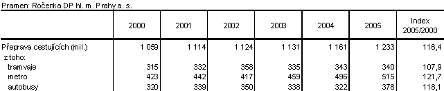 Výkony pražské MHD každoročně narůstají. Hlavním dopravním prostředkem je metro, kde byl nárůst ve sledovaném období nejvýraznější. V roce 2005 bylo metrem přepraveno 515 mil. osob. U tramvají a autobusů byly zaznamenány roční výkyvy v počtech přepravených osob, ale i zde je vzestupný trend zřejmý.