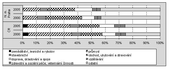 V porovnání s Českou republikou jsou ve struktuře tvorby přidané hodnoty podle OKEČ předvídatelné rozdíly. Ve sledovaném období je i v rámci ČR nadpolovičním podílem v tvorbě HPH zastoupena terciární sféra (v roce 2005 to bylo 59 %), ale ve srovnání s hlavním městem je to stále výrazně nižší podíl. Trvale téměř třetina v tvorbě hrubé přidané hodnoty připadá v rámci ČR na odvětví průmyslu (v roce 2005 to bylo 32 %), k čemuž v posledních letech mimo jiné přispěly i rozsáhlé investiční pobídky.