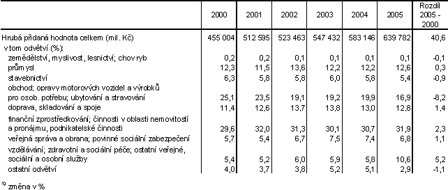 Struktura hrubé přidané hodnoty podle OKEČ v roce 2000 a 2005