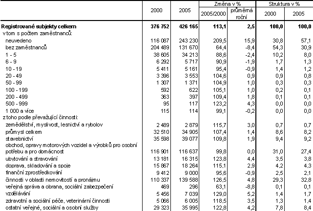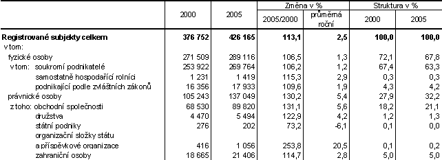 Ke konci roku 2005 mělo na území hlavního města Prahy sídlo 426 tisíc ekonomických subjektů. Oproti počátku sledovaného období, v roce 2000, se jedná o zvýšení jejich počtu o 13,1 %. Z hlediska počtu registrovaných subjektů došlo v Praze ke každoročnímu mírnému nárůstu, a to s dynamikou přibližně 2,5 % ročně.