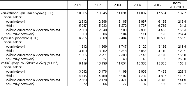 Ve všech sledovaných kategoriích došlo od roku 2001 jak k navýšení počtu zaměstnanců s tímto zaměřením, tak i k navýšení vnitřních výdajů na výzkum a vývoj.