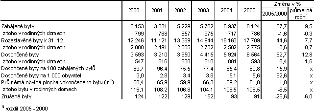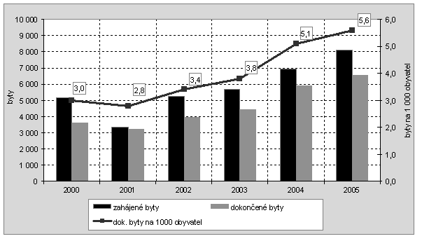 Ve sledovaném období vzrostly poměrně značně roční počty nově postavených bytů. Za roky 2000 - 2005 bylo v Praze dokončeno 27 656 nových bytů. V posledních dvou letech však byl nárůst nejvýraznější. V roce 2005 bylo v Praze dokončeno 6 564 nových bytů, což je počet srovnatelný s údaji v 1. polovině 80. let, kdy v Praze byly budovány rozsáhlé sídlištní komplexy. Také v současnosti jsou v Praze stavěny nové byty převážně v bytových domech, což je dáno především omezenou dostupností ploch pro další výstavbu. Lze předpokládat, že nárůst počtu dokončených, ale i zahájených bytů bude v několika následujících letech patrně ještě pokračovat. Jednou z příčin je i trvale příznivá situace na trhu práce, která je pro Prahu typická.