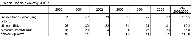 Páteří automobilové dopravy je systém pozemních komunikací v celková délce 592 km (více než 5% nárůst oproti roku 2000), přičemž samotná délka silnic a dálnic bez místních komunikací dlouhodobě osciluje kolem 70 km (dopravní ročenka Ministerstva dopravy).