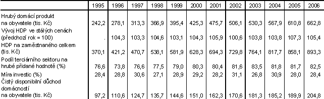 Hrubý domácí produkt jako základní makroekonomický ukazatel, který se používá pro stanovení úrovně, výkonnosti a dynamiky ekonomiky v přepočtu na obyvatele v Praze v roce 2006 představoval dvojnásobek celorepublikového průměru (2,1) a téměř trojnásobek (2,8) hodnoty kraje s nejnižší výší tohoto ukazatele (kraj Olomoucký). Tato hodnota byla 662,8 tisíc Kč. V roce 1995 (na počátku sledovaného období) byla výše HDP na obyvatele v Praze 242,2 tisíc Kč a převýšení ve srovnání s hodnotou za ČR i za region s nejnižší hodnotou HDP (opět Olomoucký kraj) bylo poněkud méně výrazné, tehdy byl HDP na obyvatele v Praze 1,7 násobkem celorepublikové hodnoty a 2,0 násobkem Olomouckého kraje. Lze tedy říci, že Praha se v tomto směru ostatním regionům postupně stále více vzdaluje. Obdobnou tendenci lze sledovat i ve srovnání se sousedním krajem Středočeským, v roce 1995 byla v Praze zaznamenána hodnota, která představovala 2,0 násobek hodnoty za Středočeský kraj a v roce 2006 již 2,3 násobek. Ovšem vývoj výše HDP ve stálých cenách se v Praze výrazně nevymyká vývoji v ČR celkem a meziroční nárůst je zde od roku 2002 spíše nižší než v ostatních krajích. V roce 2006 bylo v Praze oproti roku 2005 zaznamenáno zvýšení o 5,4 % a jen ve 2 krajích (Jihomoravský a Olomoucký) byl zaznamenán nižší nárůst HDP. V roce 1996 mělo vyšší meziroční nárůst 5 krajů a nižší byl i celorepublikový průměr. Do roku 2001 byly vyšší meziroční nárůsty než v Praze registrovány spíše výjimečně, ale v roce 2002 byl nižší meziroční růst HDP jen 2 krajích obdobně jako v roce 2006. Ve Středočeském kraji byl v roce 2006 meziroční nárůst HDP vyšší než v hl. m. Praze a tato situace se opakovala i v letech 2004, 2002, 2000 a 1999.