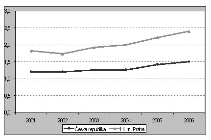 Výdaje na VaV v přepočtu na % HDP v hl. m. Praze a ČR