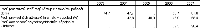Data vychází ze statistického šetření ČSÚ Využívání informačních a komunikačních technologií v domácnostech a mezi jednotlivci, které je přílohou k Výběrovému šetření pracovních sil. V letech 2003-2005 byla šetřena populace ve věku 15 a více let, v roce 2006 ve věku 10 a více let a v roce 2007 ve věku 16 a více let. V letech 2003-2004 probíhalo šetření ve 4. čtvrtletí, v roce 2005 v 1. čtvrtletí, a v letech 2006-2007 ve druhém čtvrtletí daného roku. Referenčním obdobím byly poslední tři měsíce v době šetření.