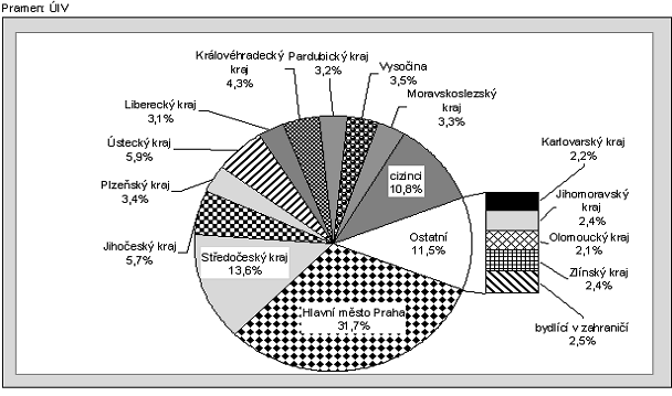 Doplňující informaci o struktuře studentů studujících na vysokých školách v Praze podává graf, z kterého je patrné, že pražské vysoké školy poskytují vzdělání obyvatelům všech krajů v České republice. Nejvíce jsou kromě pražských studentů zastoupeni studenti Středočeského kraje, významný je také podíl cizinců.
