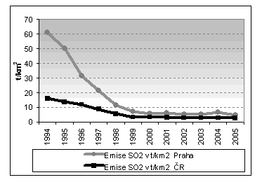 Pokud jde o vývoj výše těchto emisí ve sledovaných letech, je v Praze zřejmý zcela výrazný pokles. V Praze došlo k nejvyššímu snížení emisí SO2 ze všech regionů , z původní hodnoty 61,1 t/km2 poklesly téměř třináctkrát. K nejvýraznějšímu poklesu ovšem došlo v devadesátých letech, od roku 1999 lze spíše hovořit o stagnaci na nízkých hodnotách. Emise SO2 zaznamenaly v devadesátých letech poměrně výrazný pokles na celém území republiky, v ČR celkem to bylo téměř šestkrát. V Ústeckém kraji, který má po celé období absolutně nejhorší hodnoty emisí, došlo také k výraznému snížení (8,3 krát), ale zdaleka ne tak razantnímu jako v Praze.
