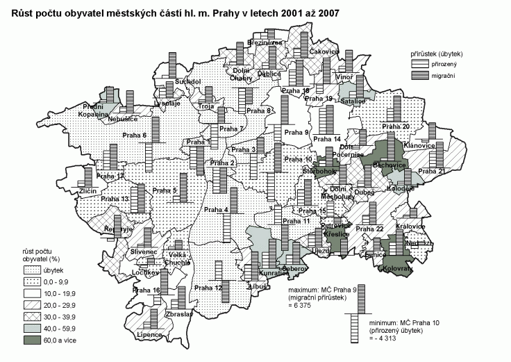 Kartodiagram 6.1.2 Růst počtu obyvatel městských částí v letech 2001 až 2007 (v %)