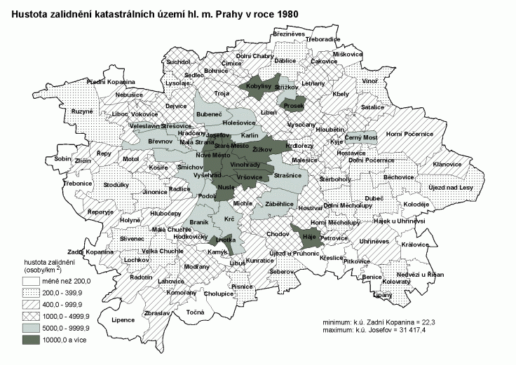 Kartogram 2.1.2 Hustota zalidnění katastrálních území hl. m. Prahy v roce 1980