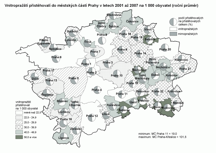 Kartodiagram 5.1.1 Vnitropražští přistěhovalí do městských částí Prahy v letech 2001 až 2007 na 1000 obyvatel (roční průměr)