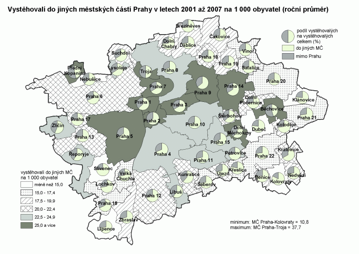Kartodiagram 5.1.2 Vystěhovalí do jiných městských částí Prahy v letech 2001 až 2007 na 1000 obyvatel (roční průměr)