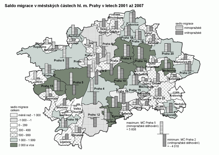 Kartodiagram 6.1.1 Saldo migrace v městských částech v letech 2001 až 2007