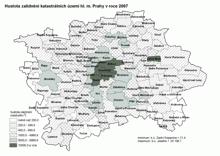Kartogram 2.1.3 Hustota zalidnění katastrálních území hl. m. Prahy v roce 2007