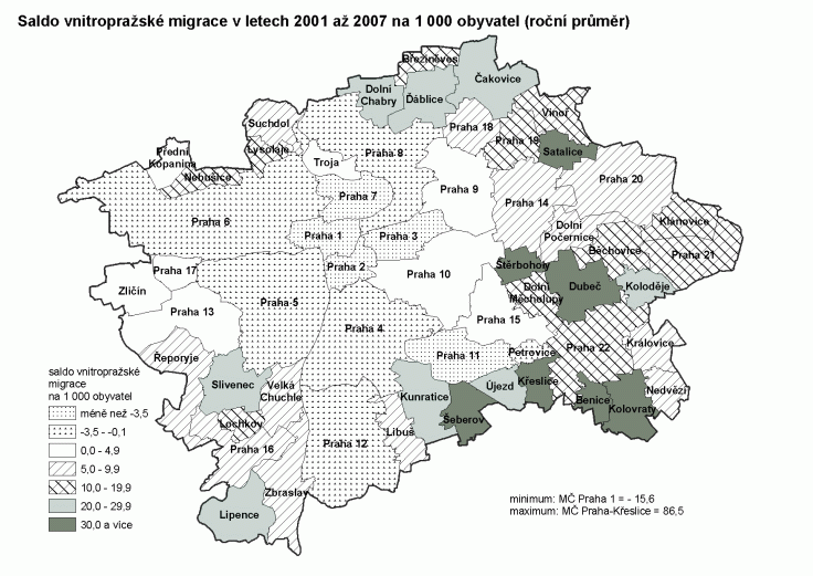 Kartogram 5.3.1 Saldo vnitropražské migrace v letech 2001 až 2007 na 1000 obyvatel (roční průměr)