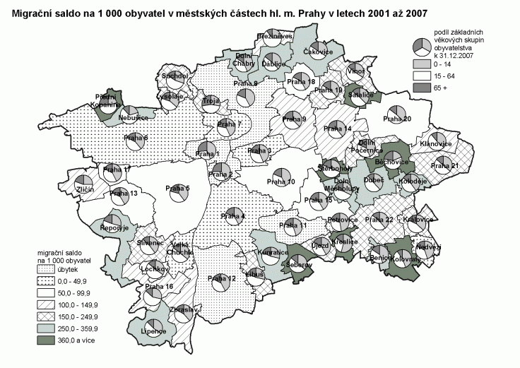 Kartodiagram 6.2.1 Migrační saldo na 1000 obyvatel v městských částech hl. m. Prahy v letech 2001 až 2007
