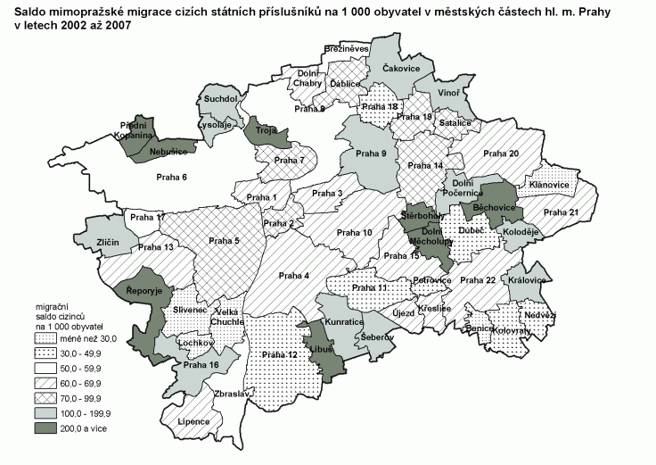 Kartogram 6.3.1 Saldo mimopražské migrace cizích státních příslušníků na 1000 obyvatel v městských částech hl. m. Prahy v letech 2002 až 2007
