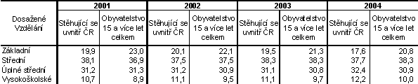Sledování migrace podle vzdělání bylo možné do roku 2004. Od tohoto roku, po změně způsobu získávání údajů o stěhování, ČSÚ již uvedená data k dispozici nemá. V letech 2001 až 2004 se