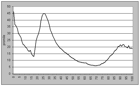Intenzita migrace v relativním vyjádření na 1 000 obyvatel se v závislosti na věku mění. U malých dětí je velmi vysoká a s rostoucím věkem klesá až k velmi nízkým hodnotám ve věku 12-17 roků. Souvisí to se stabilizací bytových poměrů rodičů a ještě nezapočatou vlastní migrační aktivitou. Ta se však od 18 roků postupně výrazně zvyšuje až k maximu ve věku 24-28 roků. Ve sledovaném období se věk největší intenzity migrace mírně zvyšuje, na počátku sledovaného období to bylo 24 roků na konci 28 roků. Postupem času se ale zmenšuje rozptyl mezi intenzitou migrace v jednotlivých věkových skupinách, vrcholy intenzity jsou méně výrazné. Po uvedeném vrcholu v intenzitě stěhování před třicátým rokem věku dochází k poklesu až k minimu ve věku 65-69 let. Poté se intenzita migrace opět zvyšuje, což vyplývá jednak ze stěhování důchodců z měst do venkovských bydlišť (i na chaty a chalupy), jednak v souvislosti se z horšujícím se zdravotním stavem, případně osamělostí a s tím pak souvisejícím stěhováním k širší rodině, ale i do domovů důchodců či jiných sociálních zařízení. Vzestup trvá až do věku okolo 92-93 let.