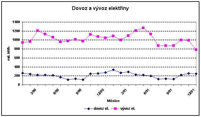 Výroba elektrické energie (na prahu elektrárny [2]) dosáhla v roce 2001 celkové výše 68 779 mil. kWh a byla proti roku 2000 o 1,5 % vyšší. Výroba se zvýšila v jaderných elektrárnách o 8,4 % a ve vodních elektrárnách o 6,7 %, zatímco v parních elektrárnách (vč. paroplynových, plynových a spalovacích) poklesla o 0,4 %. Tuzemská spotřeba, jejíž celková úroveň dosáhla 59 240 mil. Kwh, vzrostla v roce 2001 proti roku 2000 o 2,6 %. Přitom spotřeba velkoodběratelů vzrostla meziročně o 2,4 %, z toho odběr z energetických sítí se zvýšil o 6,0 %, zatímco účelová spotřeba (spotřeba elektřiny vyrobené vlastními závodními elektrárnami velkoodběratelů) se snížila o 7,7 %. Spotřeba maloodběratelů se celkově zvýšila o 3,1 %, z toho u domácností o 3,0 % a u malých podnikatelů o 3,4 %. Ve čtvrtém čtvrtletí 2001 vzrostla tuzemská spotřeba o 3,7 %, z toho u velkoodběratelů o 1,7 % a u maloodběratelů o 5,9 %. V zahraničním obchodě s elektřinou se v roce 2001 poněkud zmírnil nepříznivý trend v růstu vývozu. Celně deklarovaný dovoz vzrostl v roce 2001 o 9,8 % a činil 2 612 mil. kWh, zatímco vývoz poklesl o 1,9 % a dosáhl celkové úrovně 12 151 mil. kWh. Celkové saldo dovozu a vývozu (vč. neplánovaných výměn) představovalo 9 539 mil. kWh ve prospěch vývozu (v roce 2000 činilo 10 017 mil. kWh).